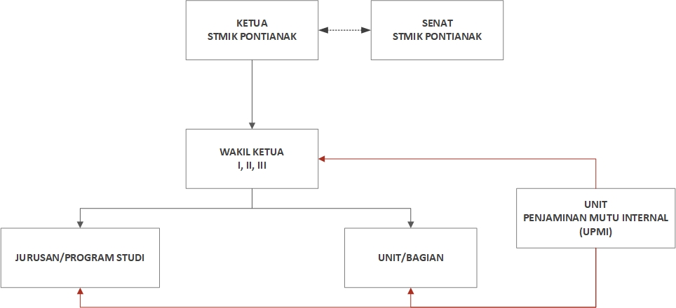 Dalam pelaksanaan sistem penjaminan mutu di tingkat Jurusan/Program Studi/unit kerja, dalam menjalankan tugas dan fungsinya, UPMI memiliki garis koordinasi dengan Pimpinan STMIK Pontianak. UPMI melaksanakan tugas dan fungsi sebagai Bagian Sistem Penjaminan Mutu, Bagian Sistem Audit Mutu Internal dan Bagian Sistem Informasi Penjaminan Mutu.